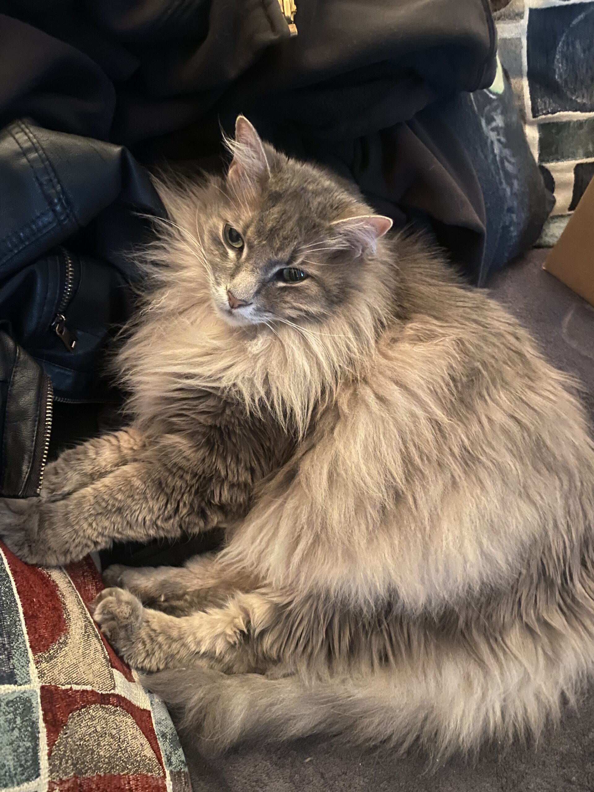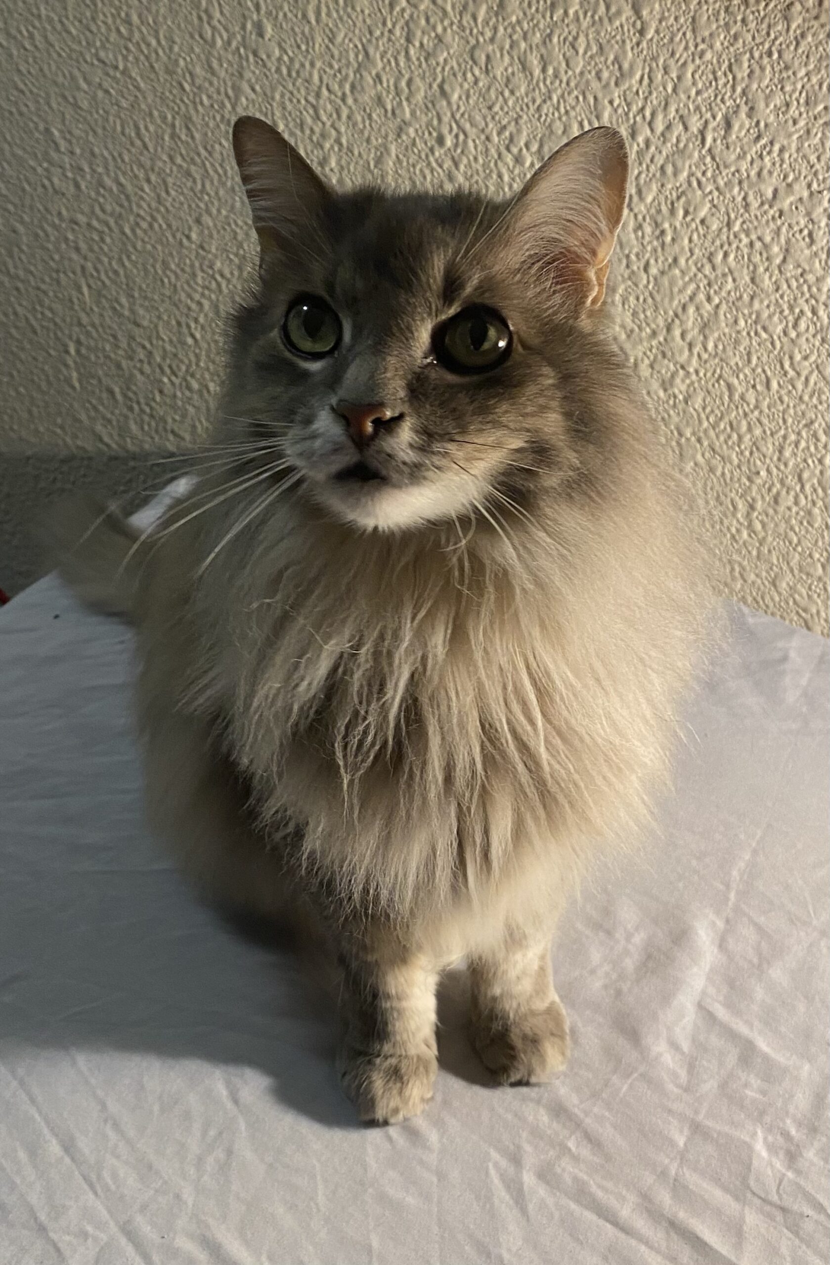 Kevin was a creature of charming quirks: he insisted on drinking from a dripping bathroom faucet, he was an expert inspector of any open bag or carrier, and he loved to be the "little spoon" in bed, throwing himself down to snuggle as close to Eric (or me) as physically possible. He enjoyed watching TV, staring at himself in the mirror (and monitoring the room), and having his beautiful fur combed. Eric could just tap the comb and Kevin would come running! Kevin was happiest at the edges of the action, but was always there—dignified, fluffy, and deeply loved.